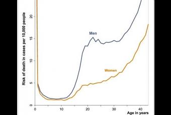 Pourquoi ce lien entre "accident hump" et maturité sexuelle des garçons? C'est tout simple, expliquent les auteurs, quand les garçons deviennent physiquement matures, ils prennent davantage de risques et le risque de décès augmente. Le même phénomène existe chez les singes mâles et se produit parce que les jeunes mâles adoptent un comportement particulièrement à risque lorsque la libération de la testostérone atteint son maximum. Des démonstrations de force, la négligence et une plus forte propension à la violence conduisent à une augmentation du nombre d'accidents mortels. La probabilité reste faible, mais le taux grimpe considérablement (voir graphique).