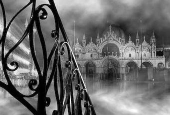 C'est une nuit magique où le regard s'embue et les sons s'adoucissent.Au détour d'une ruelle une volée d'escaliers accompagne vers la place inondée de nuages.Au bout de la piazza aux lumières diffuses, la basilique, voilée de brumes, glorifie San Marco.Comme dans un rêve, le spectacle irréel de Venise baignée de vapeurs d'opaline s'estompe aux premières lueurs du matin.