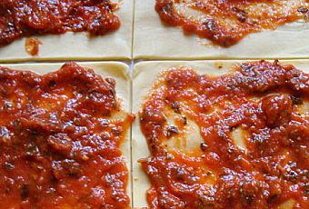 1 Préchauffez le four a 180 c 'th.6). posez devans les carrés de pate. déposez dessus 1 cuillérée a soupe de tomate puis de la mozzarella tranchée et 1/2 tranche de jambon pliée.