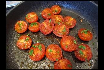 Dans une poêle, faites chauffer l’huile d’olive. Mettre les tomates côté pulpe dans la poêle. Laissez compoter pendant 5 minutes. Baissez le feu et retournez les tomates cerises. Salez, poivrez. Ajoutez le persil, et l’ail si vous souhaitez en mettre.