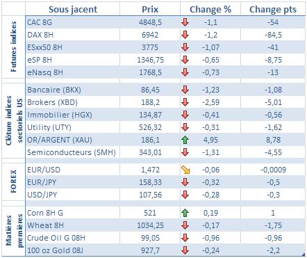 Hier les marchés américains ont reculés légèrement. Les technos de l'indice Nasdaq se sont repliées de 0.89% alors que les valeurs du secteur financier (BKX, XBD) ont largement sous performées tous les indices. Le gagnant de la journée était le secteur des métaux précieux avec un bon de près de 5%. Ce matin les futures américaines pointent vers une ouverture en baisse significative avec l'emini SP500 à -0.65%. Si les US ouvrent dans ces conditions ou encore plus en baisse on surveillera le « break out de la première heure ». La théorie veux que lorsque nous ouvrons aux US en baisse par apport à la clôture, une sortie par le haut du range de la première heure (15h30/16h30) affaibli considérablement les chances de voir une tendance baissière se mettre en place dans la journée. En revanche, une sortie par le bas du range et un indice qui va de plus bas en plus bas après 16h30 indique que les probabilités de clôturer en hausse sur la journée sont extrêmement faibles (et d'ailleurs dans ce cas, l'indice cloture très souvent au plus bas du jour). Aussi gardez à l'esprit qu'une ouverture avec un fort décalage est plutôt un signal contrarient, c'est-à-dire qu'acheter des ouvertures en baisse et vendre lorsque le SP ouvre en forte hausse donne beaucoup plus de chance de réussite que l'inverse. J'entends trop souvent les gens dire que les futures US dans le vert c'est bon signe pour la hausse, c'est statistiquement faux !