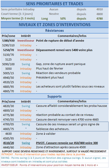 Du coté technique, les divergences haussières citées hier se sont validées entrainant un rallye impressionnant hier. Mais ce matin nous sommes de retour à la case départ, toujours sur le niveau clefs des 4820. L'ADX du graphique quotidien nous indique que le mouvement débuté le 11 février est sans puissance, gardons à l'esprit que le trend est toujours baissier et que sans signal majeur nous ne pouvons pas prendre de positions swing agressives. L'idéal serait de pouvoir vendre de manière très agressive sur un véritable excès vers 5000/5100, mais nous n'y sommes pas. En intraday, pas de changement. Nous n'avons pas de sens prioritaire dans ce contexte d'incertitudes entre 4820 et 4895. Evidement, on achètera le plus proche possible des 4820 et on vendra le plus proche possible des 4895, une fois une de ces bonne passée le sens prioritaire sera vendeur sous 4820 pour viser 4780/45 et acheteur au dessus de 4895 pour viser 4950/5000. On portera une attention particulière aux chiffres du CPI (inflation) et aux mises en chantiers tous deux à 14h30, évitez d'être exposer à ce moment. Ce soir nous attendons aussi les minutes du meeting FOMC, nous préférons donc éviter l'overnight.