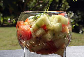 Dans des verrines ajoutez le mélange concombre-tomates et assaisonnez de vinaigrette.