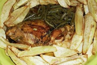 Pour servir avec j'ai fais cuire des haricots verts en cocotte avec un peu d'oignon , coriandre et sel, une foi cuits je les égoutes et je les ajoute a la sauce du poulet , j'ai fais cuire aussi des frites a coter , voila , regalez -vous !