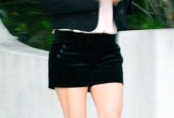 Sortant de sa maison Californienne de Los Feliz, Rachel est apparue absolument parfaite, en ensemble très chic noir et blanc : blouse blanche, gros noeud en ruban de satin, mini short et talons nude skyscrapers qui semblent venir tout droit de chez St Laurent. On adore, et on suit la tendance !