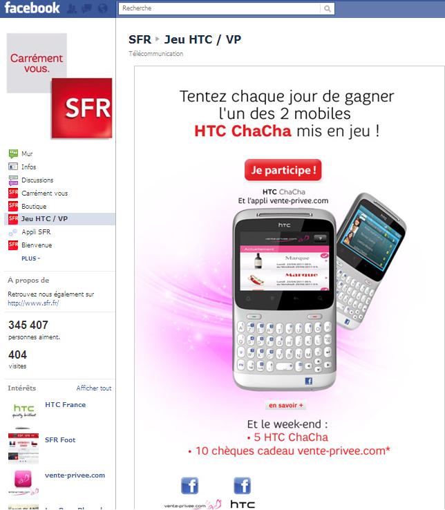 Quant au réglement - http://ns210324.ovh.net/sfr/_jeufacebook/201108-vp/assets/Reglement_jeu_HTC-VP.pdf - il indique que le jeu se déroule du 22/08 au 28/08/2011 inclus, via la page Fan « SFR » sur Facebook, dans l’onglet «Jeu HTC - VP» : URL = http://www.facebook.com/SFR . Cependant le réglement a glissé une coquille puisque les dotations du weekend comprennent 10 chèques cadeaux Ventesprivées.com d'une valeur unitaire de 30€ TTC, valable sur le site ventesprivées.com sans limitation de durée.