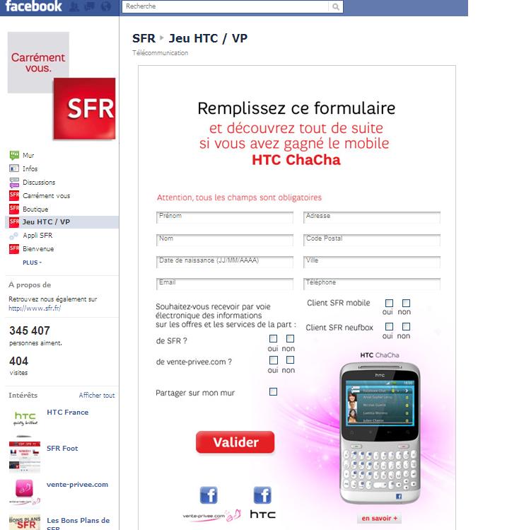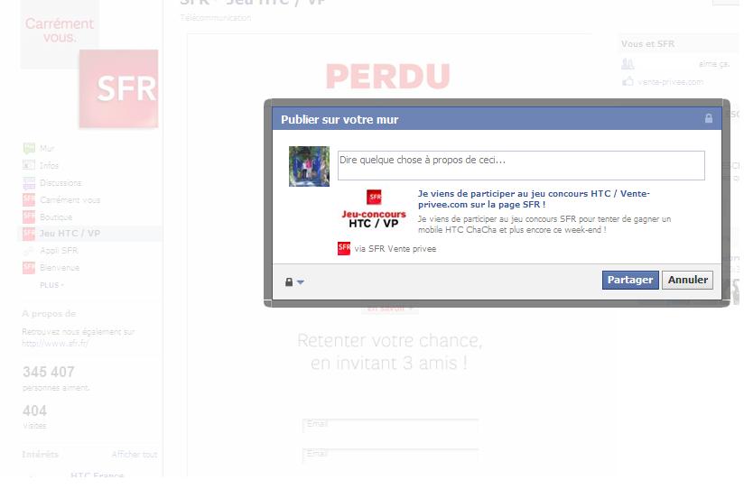 Voyant le logo de Vente-privee partagé une pub SFR sur le site de Facebook, je décide d'en savoir plus sur le dispositif de ce jeu.