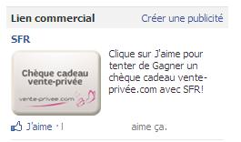 La publicité me redirige sur la fan page de SFR https://www.facebook.com/SFR, qui m'incite à cliquer sur le bouton "J'aime" pour participer et tenter de gagner un chèque cadeau Vente-privee.com . On y devine les codes graphiques de vente-privee.com, et le célèbre rose.