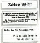 Extrait du Journal Officiel allemand daté du 27 novembre 1933. La loi "contre les récidivistes dangereux, et sur les mesures disciplinaires pour améliorer la sécurisation" est paraphée par Adolf Hitler