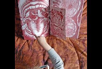 On entre dans les bouches, on laisse aller ses doigts à travers les membres et les arbres, les insectes, les organes, les paysages flottants... des blessures déchirent ces dioramas immatériels. Les corps sont éventrés, les mâchoires ouvertes, écartelées... et parfois, un visage vide que la main approche sans pouvoir envelopper... limbes...