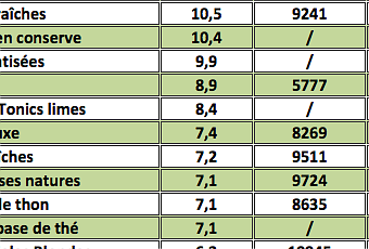 Je vous propose donc de découvrir les familles des produits ayant rencontrées le plus fort impact météorologique sur leurs ventes (vert), ainsi que ceux ayant le plus souffert (orange).