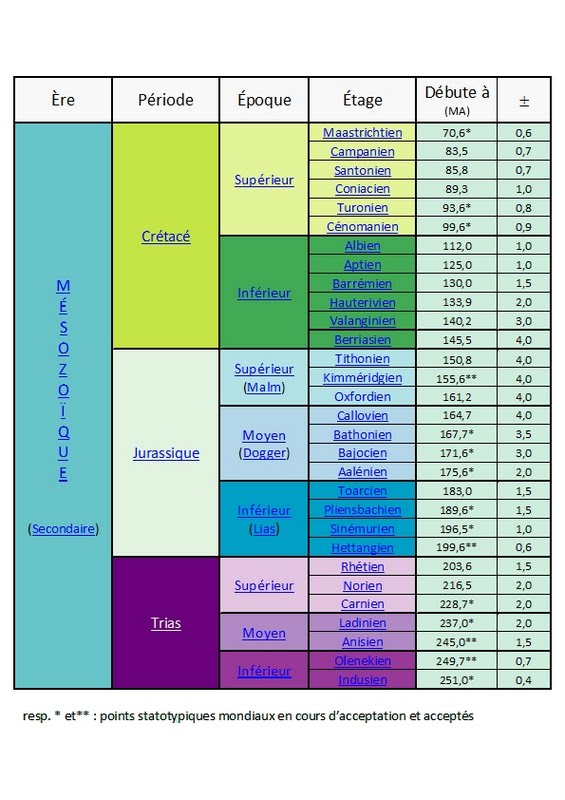 Pour plus de clarté, un tableau résumant les différents étages stratigraphiques de l'ère secondaire.