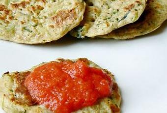 Recette des blinis: 3 cs de farine de maïs + 3 cs de farine de blé - 1 cc de bicarbonate de soude - 1 pincée de gomasio + 1 pincée de sel - 1 oeuf - lait - 1 morceau de courgette