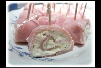 Sur votre tranche de jambon vous étalez partout votre fromage ail et fines herbes à tartiner, vous n’avez plus qu’a rouler votre jambon. Ensuite on coupe en petite part égale, et on pique pour que tout tienne, quelque chose de tout simple mais un vrai délice. Ca plait beaucoup.