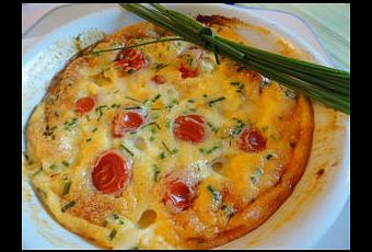 Ingrédients pour deux petits plats : 175g de tomates cerises - 125g de mozzarella - 18cl de crème liquide - 3 oeufs - 3 c à c de maïzena - 10g de beurre - 6 brins de ciboulette - sel et poivre.