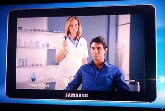 Et pourtant, après le journal et avant la météo, toutes les publicités pouvaient être vues sur l’écran d’une Galaxy Tab 10.1 comme l’illustre les images suivantes. Une façon originale de présenter la tablette mais aussi certainement plus coûteuse pour la marque.