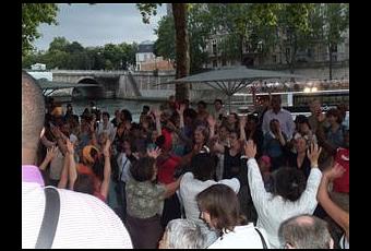 C’était presque le dernier jour de Paris Plage, juste avant le dernier week-end. Des percussions se font entendre et les musiciens chantent un « Messieurs Mesdames, bien le bonsoir », auquel répondent les spectateurs qui attendent les danseuses. Elles arrivent et, aussitôt, occupent le plateau, couleurs, sourires, pas, énergie, ondulations, regards… Le public tape des mains, impatient, semble-t-il, de partager cette danse. Elles forment deux cercles et l’espace manque pour en faire un troisième. Quelques minutes d’apprentissage et toutes celles et tous ceux qui forment les cercles sont capables de partager les pas et les gestes des danseuses, jusqu’au salut. Une vague de plaisir a gagné la rive de la Seine. Le soir tombe et les haut-parleurs annoncent que les plagistes vont commencer le nettoyage vespéral. Le public quitte à regret le quai ; on peut lire dans sa démarche qu’il a encore en tête les rythmes de Difé Kako.