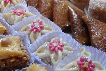 *Lunes glacées aux amandes*Cornes aux amandes* Bouchées de cacahuètes fondantes* Macarons d'Amandes*Makroute en fleur el louz*Baklawas amandes, cacahuètes*yasmina*Briouates aux amandes*Boules de neige*Chebakias