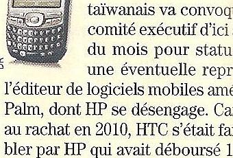 Alors que Samsung pourrait être intéressé par un rachat de webOS, on apprend que HTC serait aussi sur le coup ! Nos confrères d’accessoweb citent en effet un petit encart paru dans le magazine Challenge du 25 aout, comme quoi le constructeur taiwanais aurait réuni un comité exécutif à la fin de ce mois pour statuer sur un éventuel rachat de webOS à HP ! Pour rappel, HTC faisait partie des entreprises en lice pour le rachat de Palm il y a un peu plus d’un an, mais s’était fait doubler par HP justement… Aujourd’hui l’ex-Palm vaudrait trois fois moins cher. Affaire à suivre.