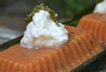 Avec cette terrine de tomates très rafraîchissante, et surtout par ces chaleurs, vous allez en séduire plus d'un. A vrai dire, j'avais tellement de tomates du jardin qu'il fallait que j'écoule un peu mon stock, cette petite recette était donc la bienvenue. C'est frais et très léger. A la base, je voulais faire un pesto classique, avec les pignons de pins, mais j'ai eu beau fouiller dans tous mes placards, je n'en ai pas trouvé... qu'à cela ne tienne, j'avais des amandes qui feraient très bien l'affaire. Ce pesto avec des amandes était un délice, je me demande même si je ne préfère pas ainsi, finalement, ce sont souvent les essais, les erreurs ou le hasard qui révèlent un plat. La ricotta, elle, apporte un peu de douceur et d'onctuosité, toutes ces différences de textures sont un régal sous le palais. Vous pouvez faire des variantes en changeant le fromage frais par de la mozarella ou des carrées frais et n'hésitez pas à ajouter des poivrons cuits à votre terrine... Si vous voulez réaliser cette recette dans un plat à terrine (et non dans des minis moules), prolongez le temps de réfrigération et conservez la terrine 6h au frais.