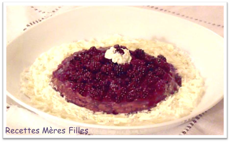 Au moment de servir : vous ajoutez au dessus les mûres égouttées et faites un tour en Chantilly juste avant de servir.
