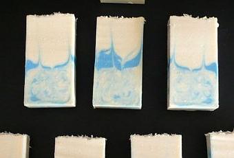 Pour l'aspect : verser en méthode one pot un mélange de pâte blanche, bleue et verte dans le premier tiers du moule. Puis verser une fine ligne de pâte colorée en bleu par-dessus (ne pas verser la pâte de trop haut pour qu'elle ne se mélange pas au reste ; je l'ai versée sur un premier support qui l'a ensuite déversée dans le moule, afin de réduire sa vitesse). Enfin, verser le reste de la pâte non colorée pour remplir le moule (idem, pas de trop haut...). A l'aide d'un cintre, marbrer le savon (à la manière de mon savon somewhere over the rainbow). Attendre que la pâte ait suffisamment durci pour déposer enfin de la pulpe de coco séchée sur le dessus.