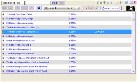 À la recherche de certaines chansons sur le net, beaucoup d'internautes utilisent des programmes de partage de fichiers (P2P) qui les plongent dans l'illégalité car ces logiciels reposent sur la notion de partage de fichiers, interdit par la loi. Clickster lui recherche pour vous sur l'Internet des fichiers MP3. Il y aurait ainsi, selon l'éditeur du logiciel, plus de 30 millions de fichiers disséminés sur les nombreux sites de la toile. De quoi vous occuper un moment ! Le logiciel intègre un player qui vous permet de les écouter directement. Sans oublier la fonction radio Ripper, qui vous permettra d'écouter une station de radio et d'en extraire la musique.