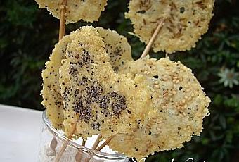 * Sur une silpat placée sur une plaque perforée ou à défaut, une feuille de papier sulfurisé sur la plaque du four, placer des emportes pièces, éventuellement de formes différentes et garnir d'une petite cuillèrée de fromages sur une épaisseur de 2 mm environ. Pensez à les espacer. Enlever les emportes pièces et incérer des pics en bois genre cure dents, ou bâtons à brochettes par exemple.
