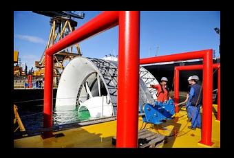 La première des trois hydroliennes d’une future centrale électrique sous-marine prévue au large de Paimpol à quitté les quais de l’arsenal de Brest hier après-midi, mercredi 31 août 2011. Elle va entamer une campagne de tests et de mesures pendant quelques jours à proximité du chantier qui l’a vue naître, avant de rejoindre son emplacement définitif à petite vitesse, portée par une barge monumentale de 58 mètres de long.