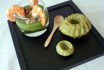 Versez le velouté dans 5 petites verrines, déposez des miettes de croustillant et décorez avec 3 crevettes sur les bords.