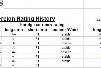 Cela a conduit l’agence de notation Fitch a avertir qu’elle pourrait dégrader la notation des titres de dette souveraine émis en yuan. Cotés AA- depuis novembre 2007, ils ont vu leur perspective dégradée déjà par Fitch en avril 2011 (voir illustration de l’article). L’AFP a ainsi cité Andrew Colquhoun, responsable des notations de la dette souveraine Asie-Pacifique, déclarant qu’il y avait « une probabilité plus élevée que jamais » que la note soit dégradée. Colquhoun a en particulier souligné les inquiétudes de Fitch sur la qualité des actifs des banques.