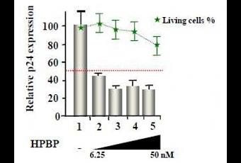 HPBP s'avère efficace sur des souches classiques du VIH mais aussi sur les souches résistantes à l'antirétroviral AZT (Figure ci-contre). La protéine HPBP se révèle donc une protéine prometteuse pour le développement de médicaments car elle cible le VIH-1 lors de sa phase de transcription, une phase du cycle encore non ciblée par les 7 autres médicaments antirétroviraux disponibles.