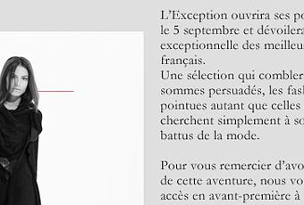 Enfin, après presque un an de travail, nous avons lancé L'Exception, le select shop de créateurs français. Vous y trouverez la crème des créateurs: des créateurs de luxe qui défilent pendant la Fashion Week parisienne, des créateurs haut de gamme qui vous proposeront de superbes produits pour l'homme ou la femme, ainsi que de jeunes créateurs dont certains fêtent leur toute première collection. Je n'en dévoile pas plus...