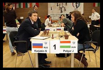 3e Tour aller : la Hongroise Judit Polgar s'est imposée avec les Blancs face à Karjakin puis l'a sorti en annulant avec les Noirs © Site Officiel