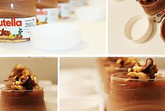 Ingrédients : 400 ml de crème fraîche à 40% MG, 100g de sucre en poudre (S0), 120g de nutella, 2 feuilles de gélatine (+ des noisettes et un peu de nutella pour la déco)