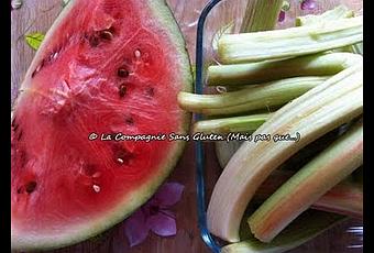 Il y a quelques jours, Belle-Maman m’a donné de la rhubarbe du jardin de Belle-Tata et il me restait un quart de pastèque… Et comme le temps n’est pas très ensoleillé dirons-nous, pas très envie de manger la pastèque à pleines dents et comme je sais qu’à la maison, les hommes ne sont pas fans de la compote de rhubarbe, je me suis dit que je pouvais peut-être mettre au point une petite invention culinaire !!!