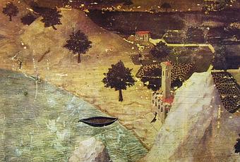 À la Pinacothèque de Sienne, on peut voir, en cherchant bien, un peu à l’écart, deux petites peintures sur bois qu’on date généralement de 1338 ou 1339. Ces deux petits tableaux pourraient passer inaperçus, mais leur intérêt est singulier : ils seraient les premiers vrais paysages de la peinture occidentale. On a certes peint auparavant des paysages plus ou moins élaborés, mais ce furent toujours des fonds, des décors, des faire-valoir pour une scène religieuse ou allégorique, ou pour un portrait. Ici, pour la première fois de l’histoire (occidentale, car en Orient, le paysage est alors déjà un genre noble à part entière) un peintre ose peindre quelque chose qui n’a pas de sens, pas de référence, pas de narration, un paysage pur pour sa seule beauté, sans aucun autre prétexte. On pourrait dire que c’est le début de l’art pour l’art.