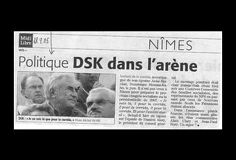 Alors voilà, enfin revenu sur le sol français, riche de traditions connes et cruelles, il va pouvoir aller dans les arènes. Bientôt, c'est la féria de Nîmes... Strauss-Kahn, il aime bien Nîmes. Rappelle-toi, il y a 6 ans presque jour pour jour, en sortant d'une corrida (avec sa femme ), il avait déclaré être à Nîmes, non pas pour de mesquins calculs politiciens mais : 1 pour la corrida, 2 pour la corrida, 3 pour la corrida.