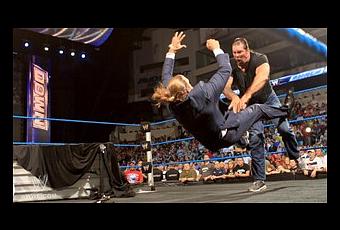 D’un mouvement rapide il envoie le Président par intérim de la WWE au sol !