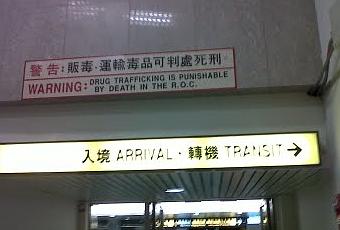 Hospitalité. Premier panneau lu en descendant de l'avion à l'aéroport Tchiang Kai Tchek: "WARNING: drug trafficking is punishable by death in the R.O.C." Heureusement, j'avais consommé toute ma drogue pendant le vol.