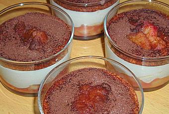Dresser les verrines : placer au fond les pêches vanillées. Verser par-dessus le mélanger de ricotta. Mettre une dernière petite c. à café de pêches et saupoudrer de cacao Monbana.