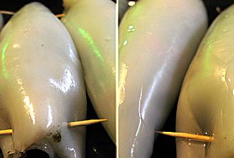 Vider et nettoyer bien correctement les encornets en commençant par enlever la tête en tirant dessus et en faisant attention de ne pas faire éclater la poche d'encre. Enlever l'arrête centrale transparente dans l'encornet, couper les nageoires à l'extérieure et enlever la peau en tirant délicatement dessus. Nettoyer bien à l'eau et sécher à l'aide d'un sopalin.