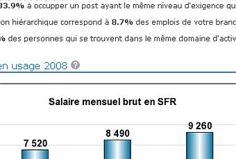 Avec ce type d’informations, vous avez une estimation de ce à quoi vous pouvez prétendre, sachant que 25% des personnes qui ont votre profil sont payées 7 520 francs suisses brut par mois ou moins, 50% perçoivent un salaire de plus de 8 490 francs suisses, et 25% touchent un salaire de plus de 9 260 francs suisses bruts par mois.