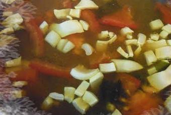 Réunir dans ce bouillon l'algue, le tofu, les lamelles de tomate, les cubes de calmars ( sans les cuire au préalable) puis la sauce soja, le piment oiseau et le curcuma.