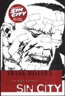 J'ai également fait un tour par ma bibliothèque municipale (qui est une vraie mine de la bd et du comic book) et j'en ai profité pour poursuivre mon exploration du comic book et du graphic novel anglo-saxon (entamée avec Maus et V for Vendetta) en empruntant Sin City, la mythique série de Frank Miller. Eh bien, je dois dire que le premier tome, The Hard Goodbye, est décevant. S'il y a un mot qui peut décrire ce volum, c'est bien "thrash". Tout est trash là dedans. C'est vraiment le genre flingues et filles à poil mais sans scénario ...Le genre de bd qui peut plaire à des garçons pré-pubères. Enfin, j'ai rien contre les trucs divertissants (ni contre la violence et la nudité car après tout, j'adore Largo Winch) mais, dans le présent cas, la lecture s'avère lassante assez rapidement. En plus, le personnage de Merv, en plus d'être idiot et vulgaire, n'est pas du tout attachant. Il ne que jurer fait répéter qu'il voudrait baiser son agente de probation lesbienne. Vous voyez le genre.