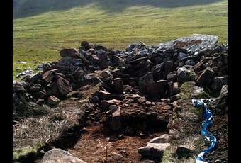 Les restes d'un monument cérémoniel ont été trouvés avec un côté qui semble constitué d'une paire de pierres debouts, noyées dans la masse.