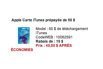Encore une fois, Best Buy offre 10$ de rabais sur une carte iTunes de 50$.
