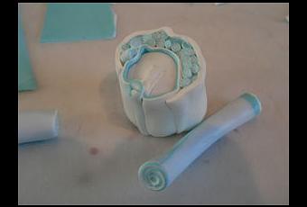 Photo de la canne pétale et du coeur, puis de la fleur dans les ton transparent , bleu et blanc