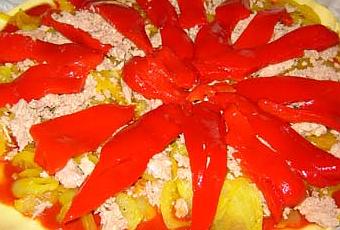 Étaler une dose de tomacouli sur le fond de tarte. Répartir les oignons dorés, puis le thon émietté.