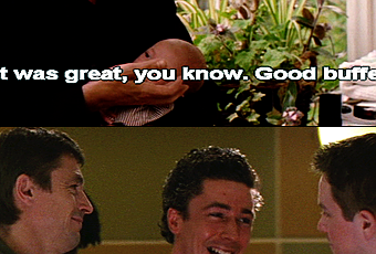 Enfin un peu de réalisme à la télévision. Enfin on nous montre qu’une personne se souvient d’un buffet pendant des semaines et en parle avec enthousiasme. Moi je me rappelle de desserts consommés à des buffets pendant des années, je pourrais écrire des poèmes à leur sujet. Le feuilleté au chocolat à Marrakech en mars 2008, il reste gravé dans ma mémoire. Je mange même des trucs que je n’aime pas quand il y a un buffet, juste parce que je le peux.